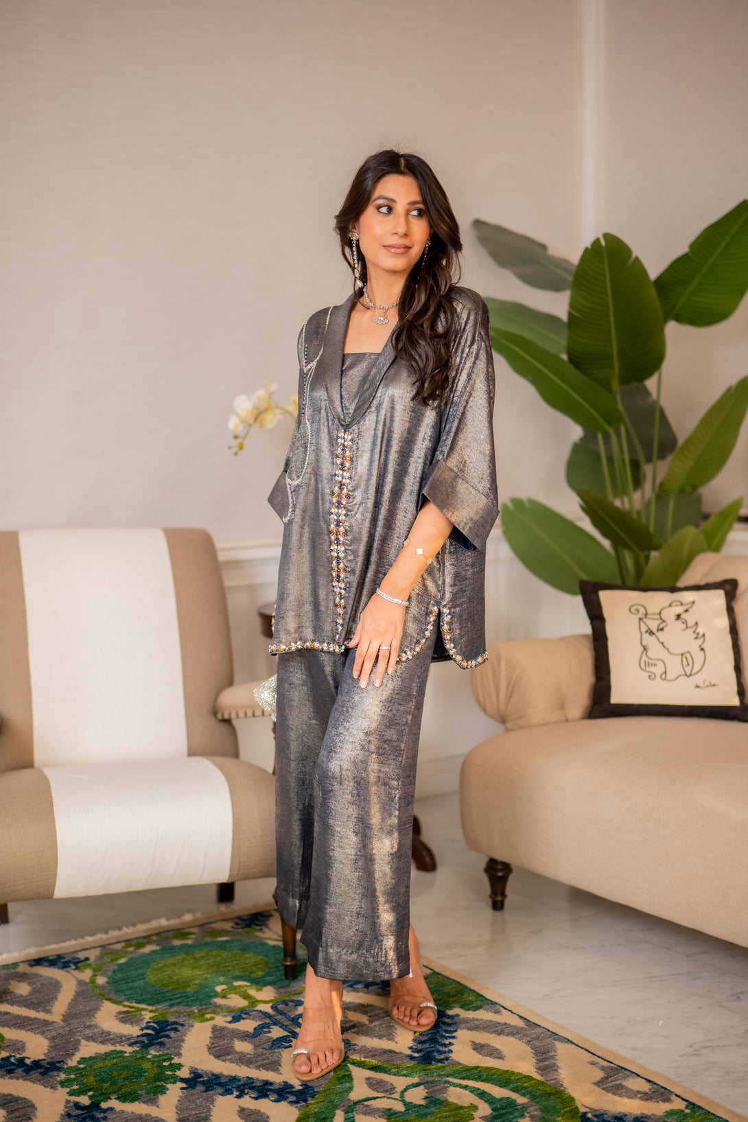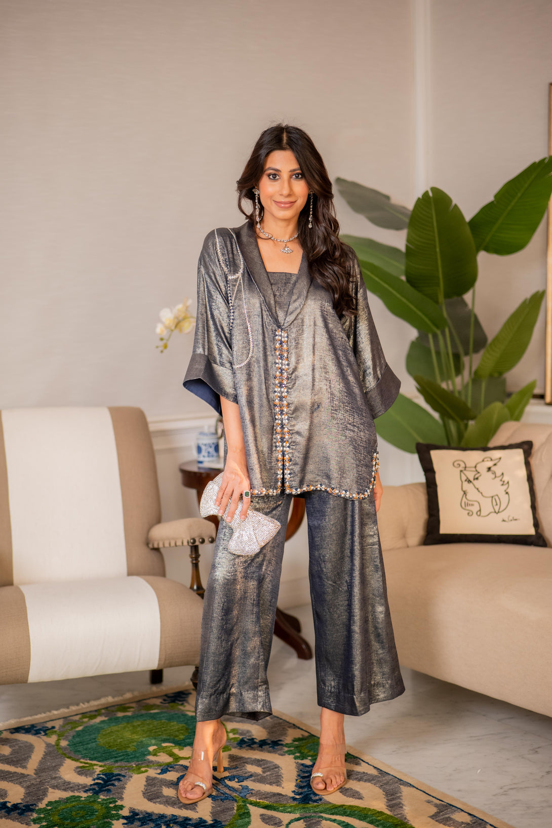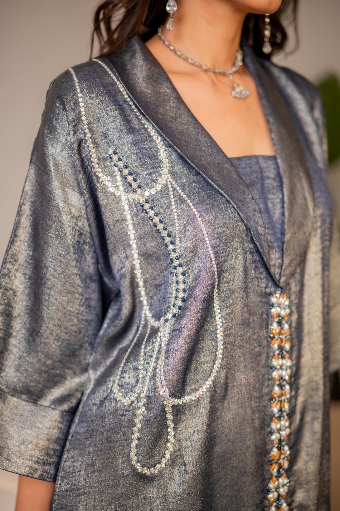 Velvet luxury meets dazzling shine! This navy co-ord is crafted from shimmery velvet silk, embellished with exquisite Swarovski, radiant stones, sparkling crystals, and delicate pearls.