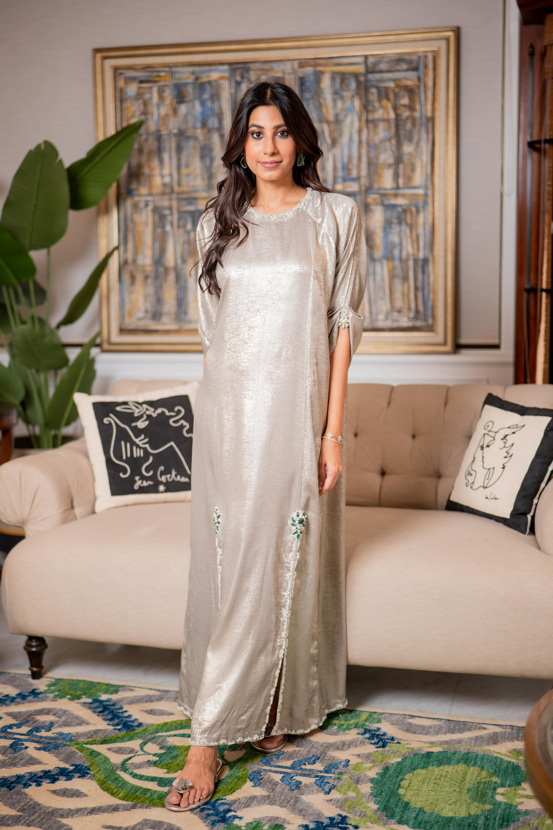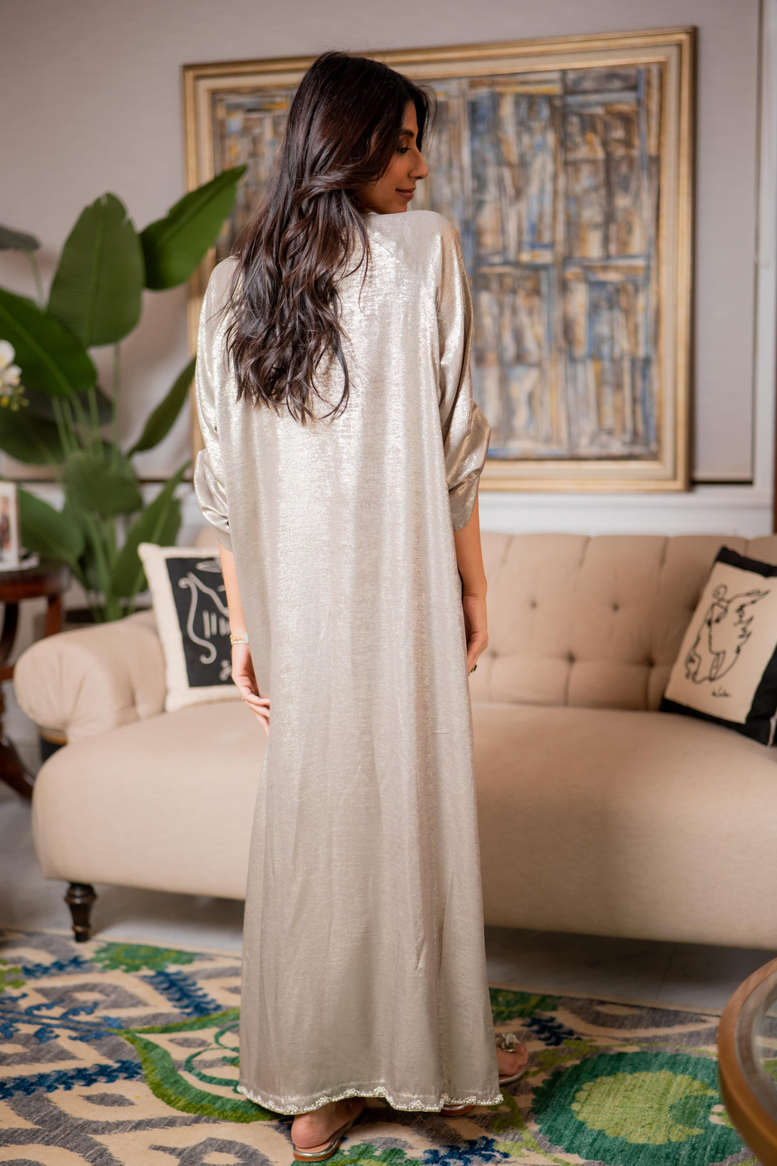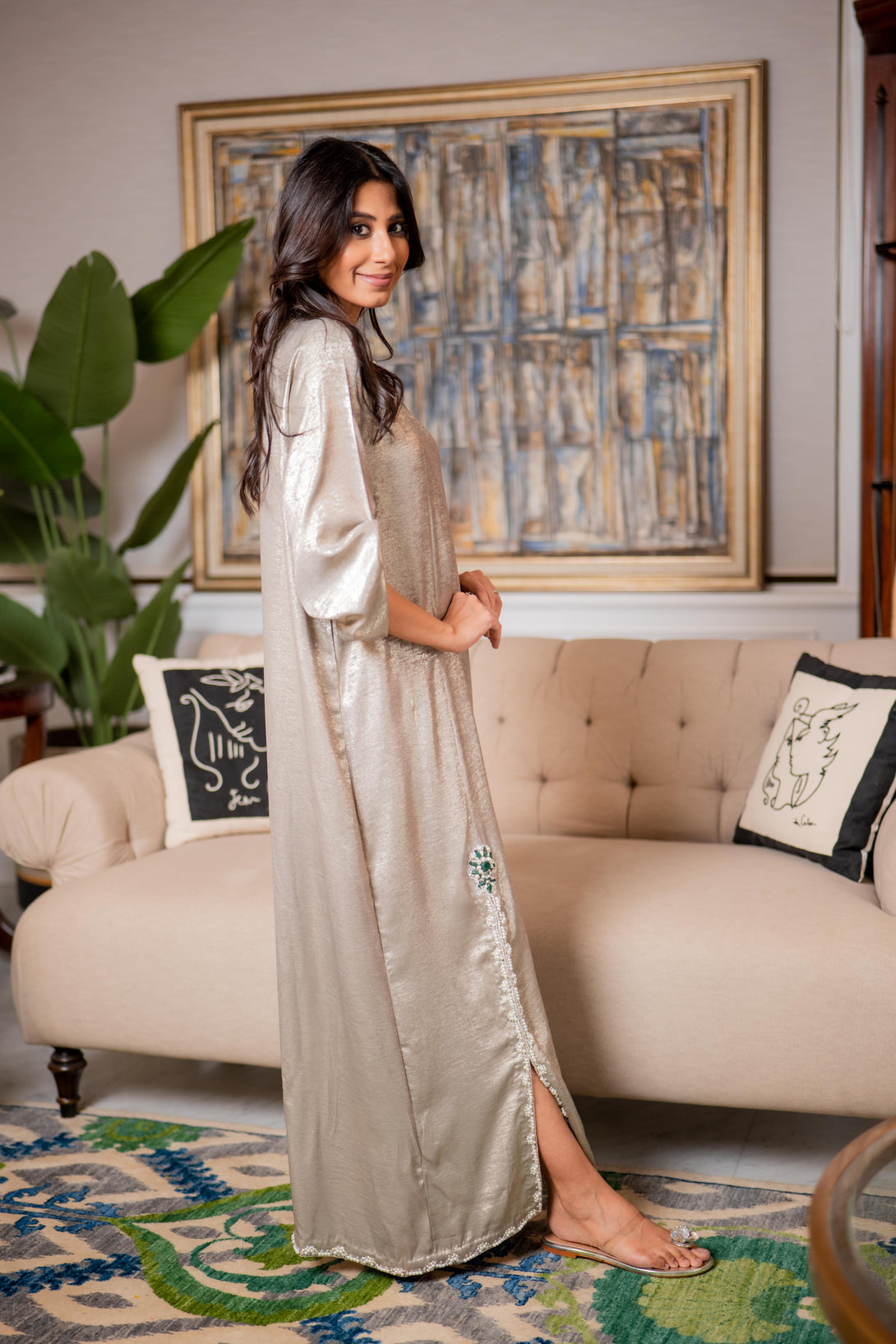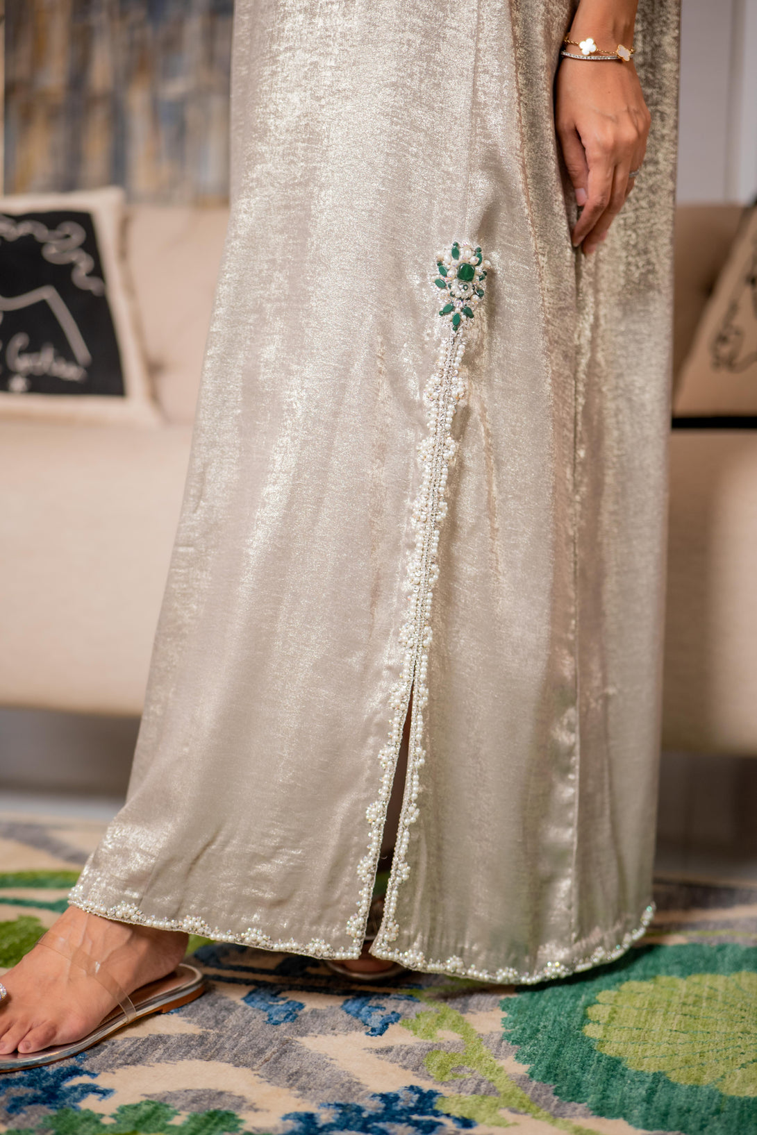 Our stunning gold shimmery velvet silk kaftan is hand-embellished with intricate stones, crystals, and pearls, making it the perfect regal choice for any celebration.